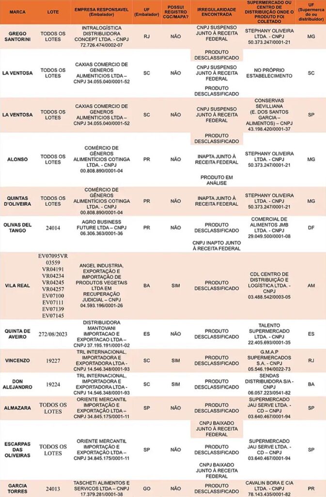 As doze marcas desclassificadas por fraudar seus produtos são a Grego Santorini; La Ventosa; Alonso; Quintas D’Oliveira; Olivas Del Tango; Vila Real; Quinta de Aveiro; Vincenzo; Don Alejandro; Almazara; Escarpas das Oliveiras e Garcia Torres.